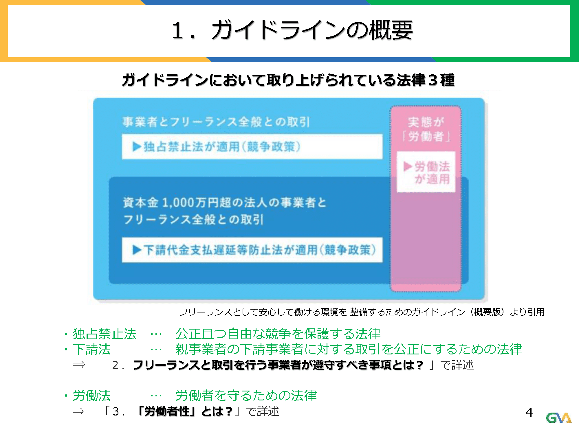 「フリーランスとして安心して働ける環境を整備するためのガイドライン」は、フリーランスの方が安心して働ける環境を整備することを趣旨としています。