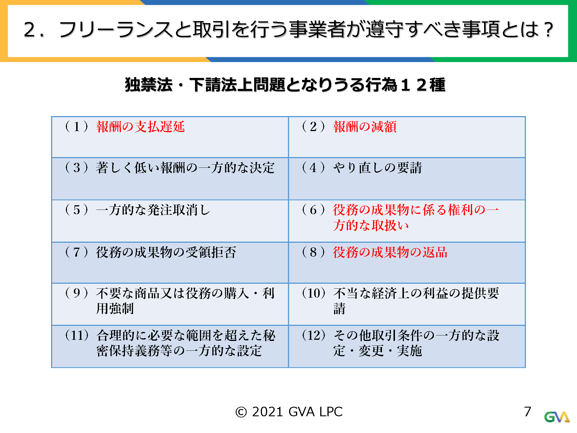 この優越的地位の濫用につながりうる行為として問題となる12の行為をこちらに記しています。今回はその中でも赤字にしている4つをそれぞれのケースで細かく見ていきましょう。