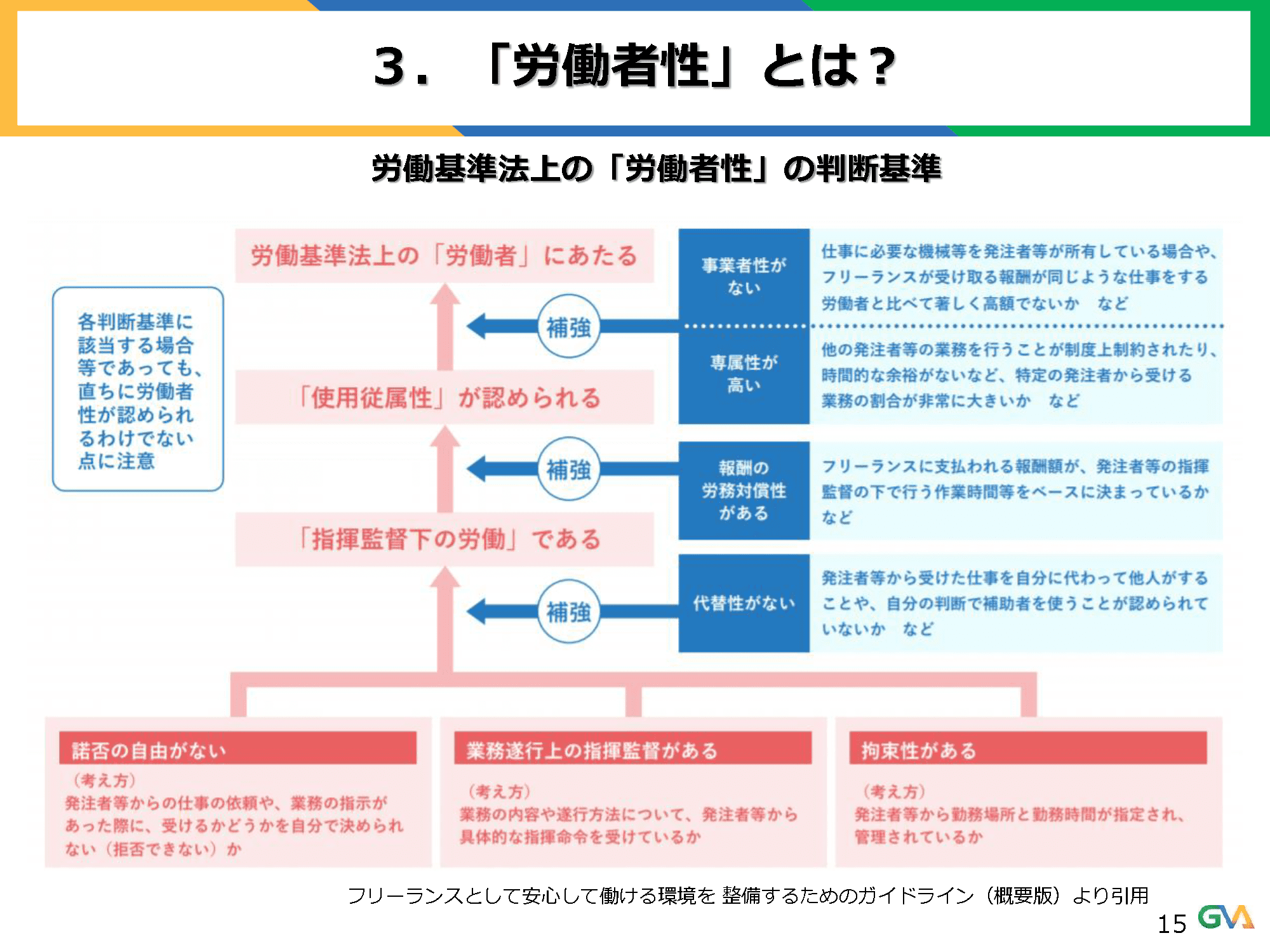 ここでは、労働法の観点についてお伝えしたいと思います。具体的にはどのような場合に「フリーランス」の方が「労働者」にあたるのか、という点です。