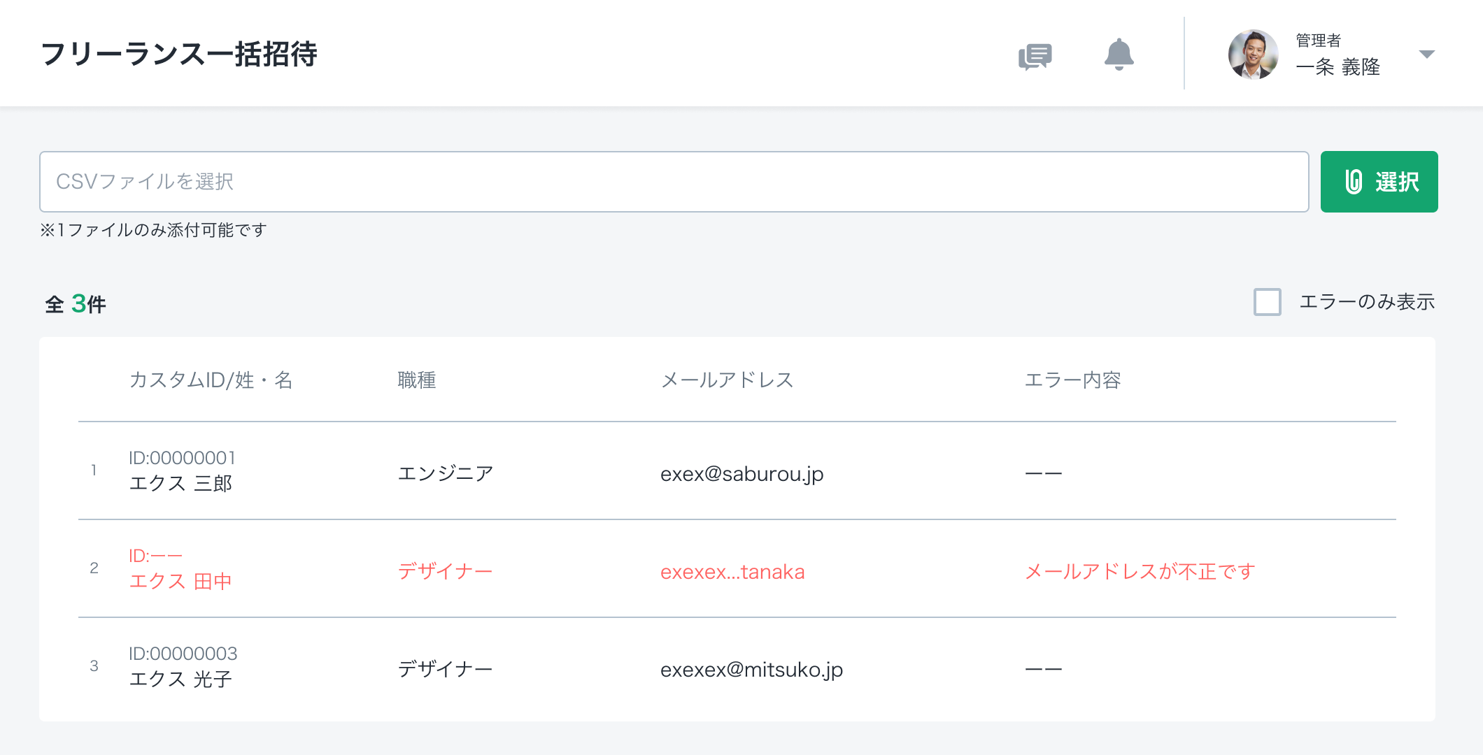 取込項目は通常の登録と同じ「名前」「メールアドレス」「職種名」が必須となっており、住所、連絡先等についても取込可能となっています。 同時にリリースしました、フリーランスIDのカスタマイズ機能にも対応しており、従業員番号なども付与することが可能となっています。