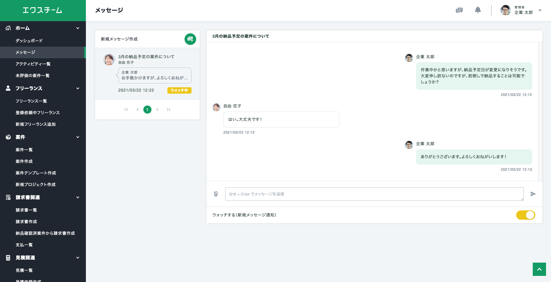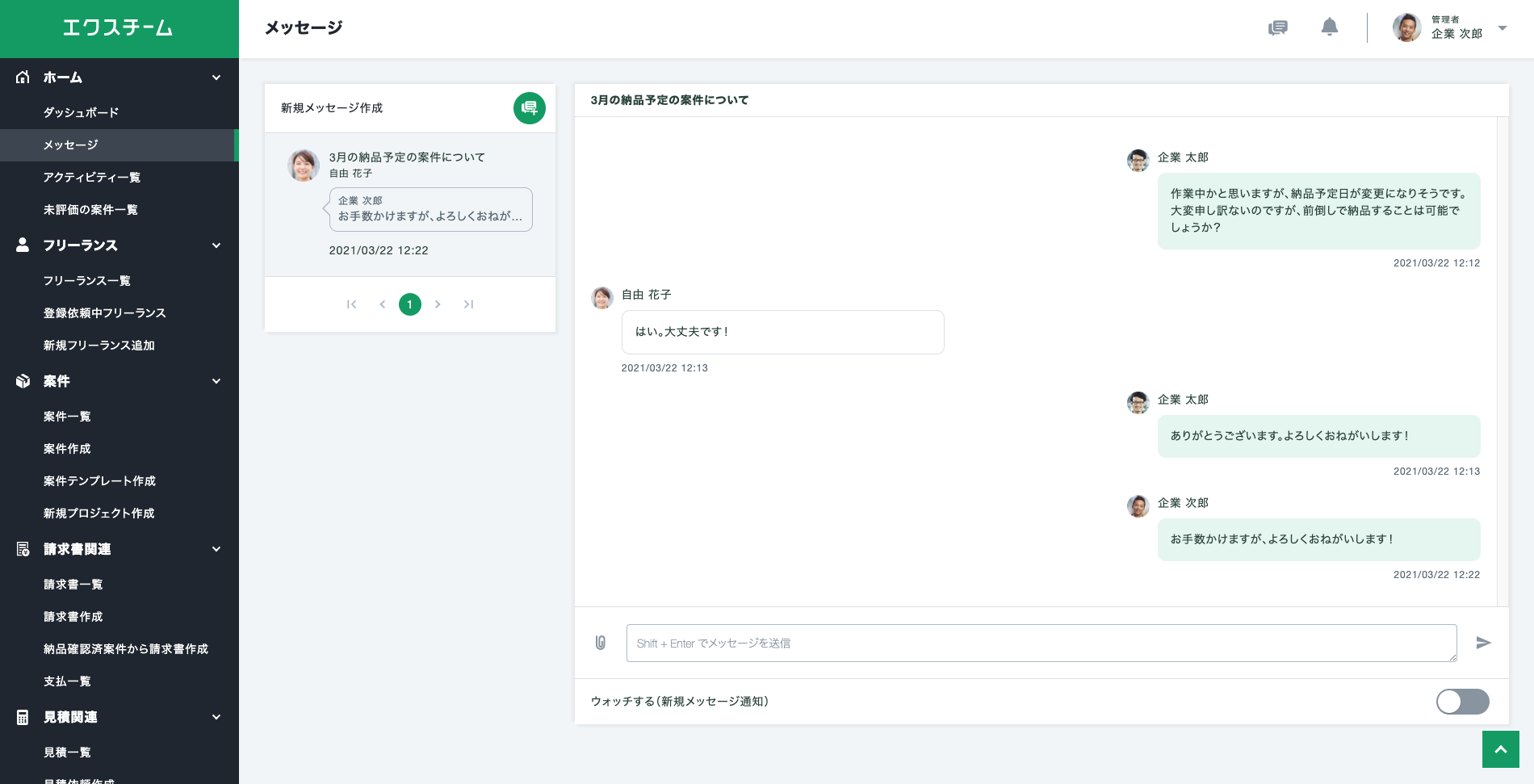 やり取りされるメッセージは記録や透明性という側面から発注企業の全ユーザから見ることができます。