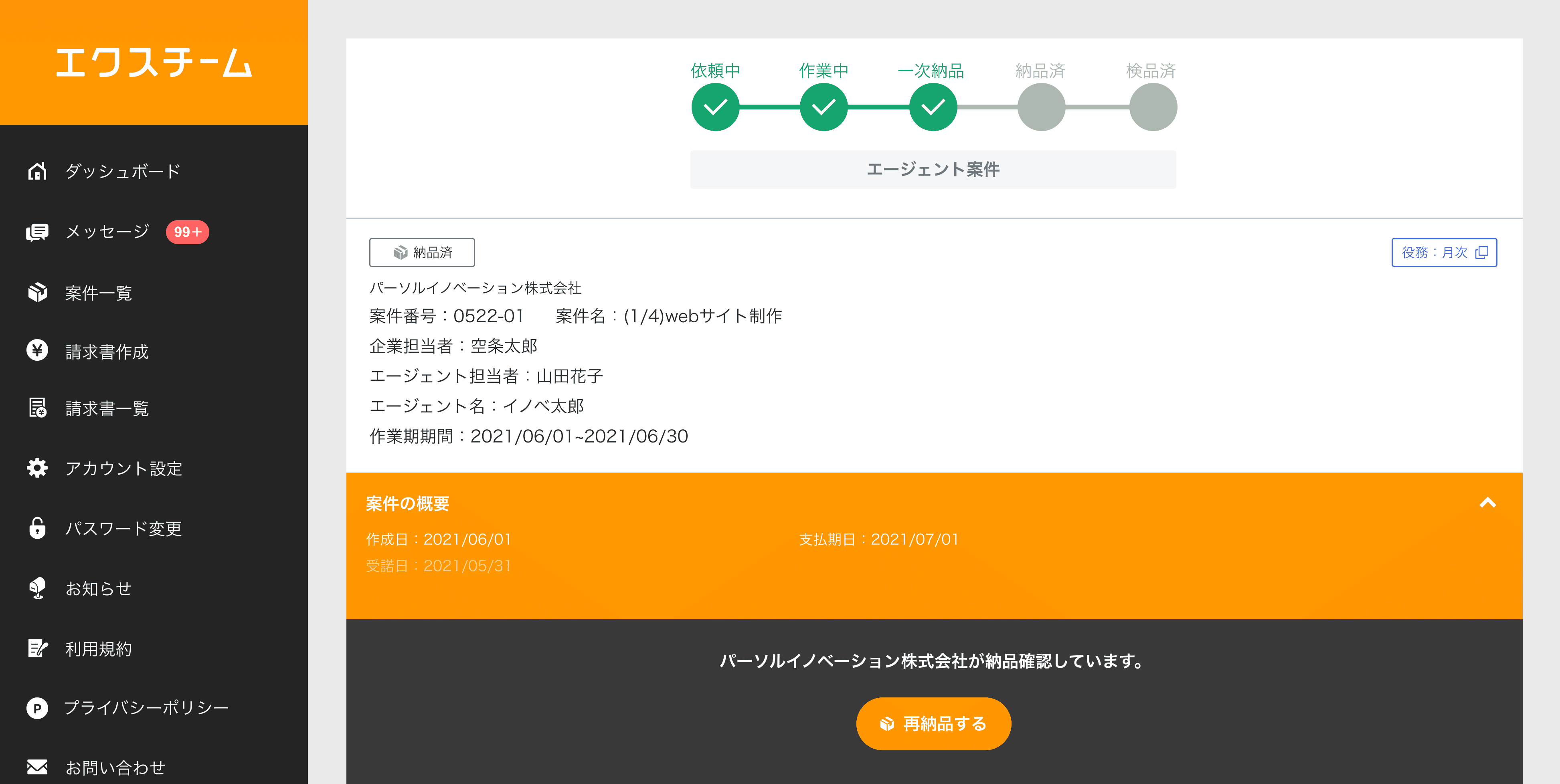 対応する場合は、案件詳細に「再納品するボタン」、請求書詳細に「再請求するボタン」が表示されます。