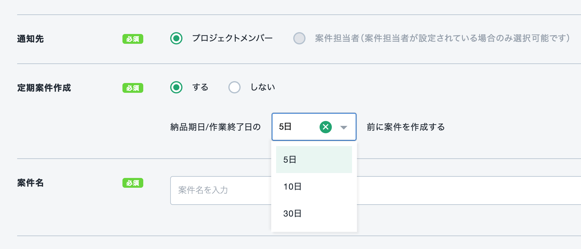 定期案件作成機能を活用する場合は、案件作成画面の定期案件作成項目を「する」にチェック入れていただき、 自動作成する日付を、契約終了日(もしくは納品日)から何日前に設定するか選んで頂きます。選べる日付は5日前、10日前、30日前から選択可能です。